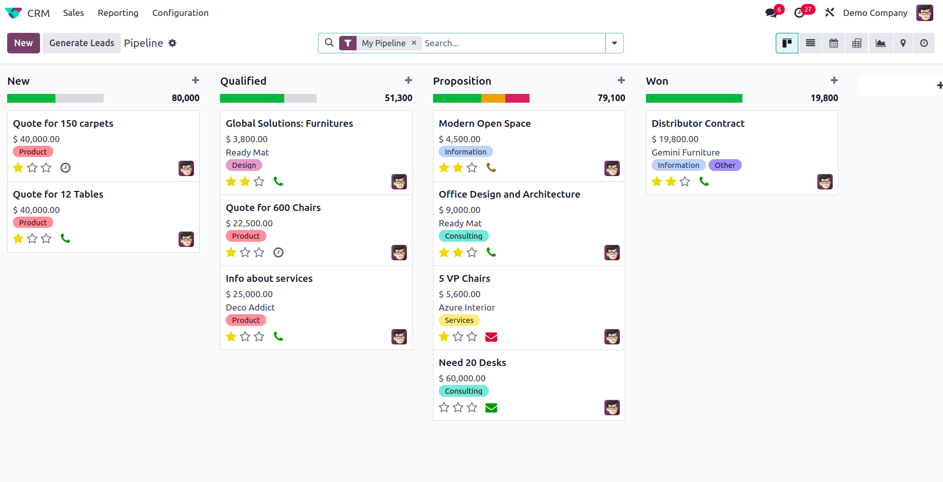 Odoo platform helps you to generate advanced analytics as well as quantitative reports on customer relationship management operations